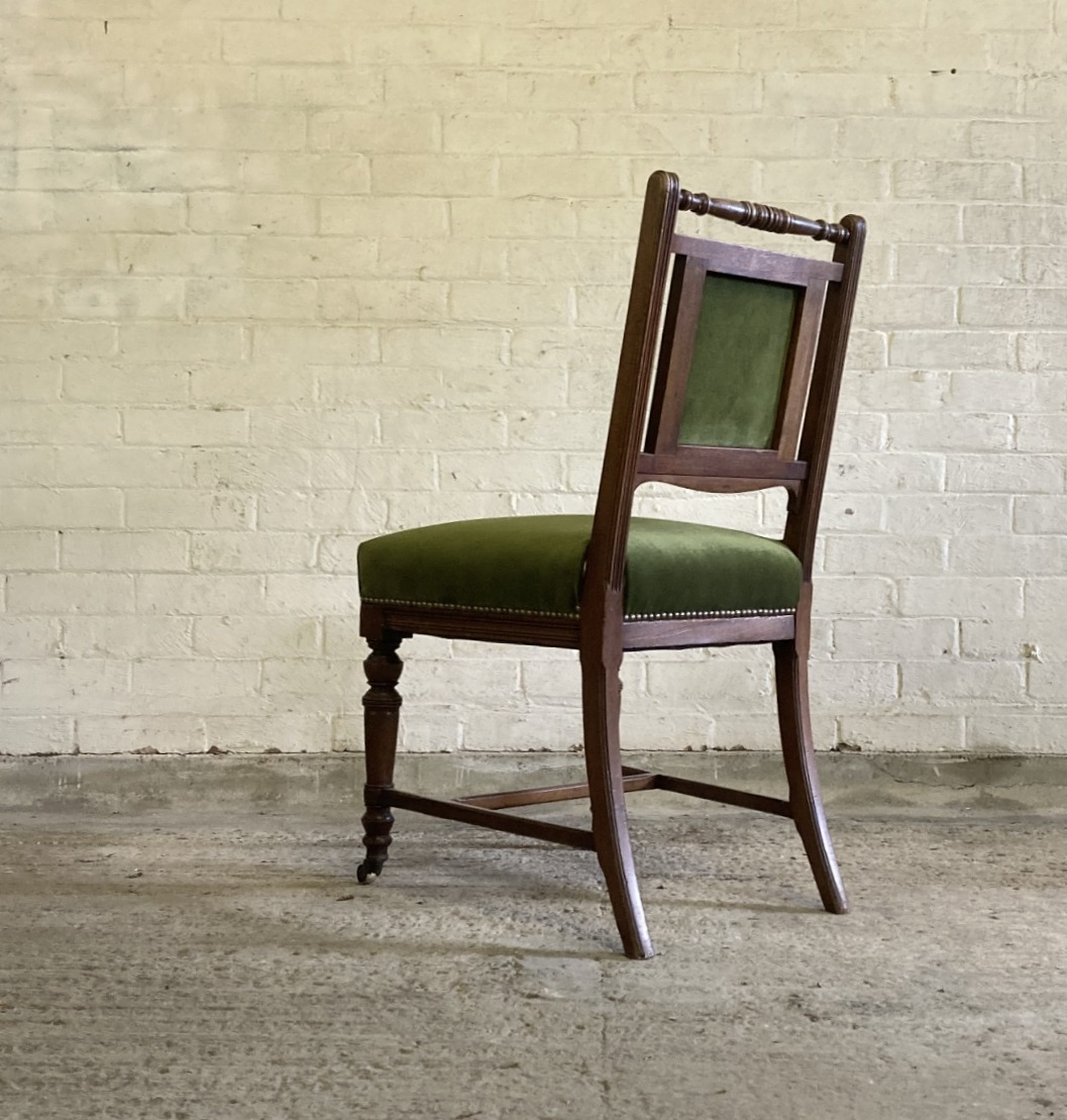 A set of 6 execptional deep seated dining chairs from renowned London makers Howard and sons. Superb quality construction with design elements inspired by Godwin. All in excellent condition with minor wear for their age. All have original stamped casters and some serial numbered on inner rear leg. Reupholstered in a green velvet with decorative nails. We also have a matching carver chair to this set in the last photo listed separately.