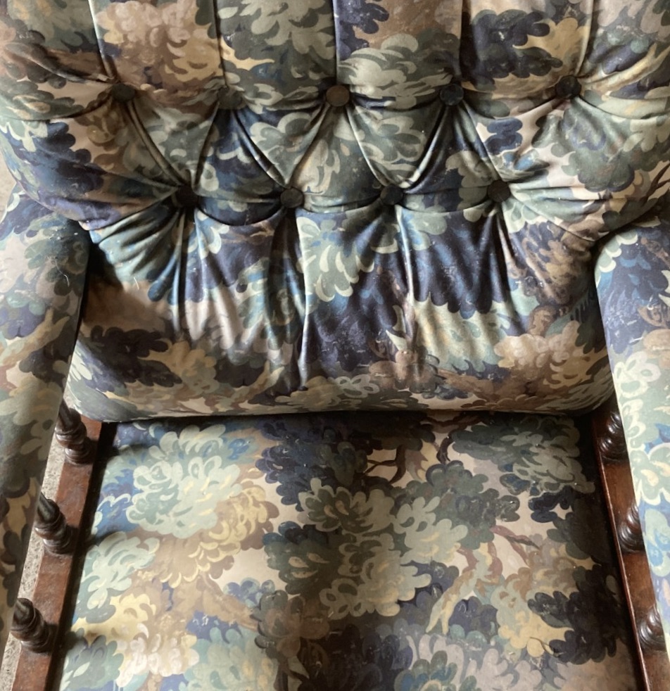 A Victorian C1880 mahogany library/reading armchair. Open arms featuring turned spindle supports, Front and rear mahogany legs on casters. Completely solid frame and traditionally restored upholstery. Recovered in Oak Leaf velvet by Linwood fabric. Seat height 39cm